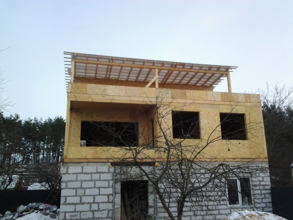 Каркасна прибудова до будинку, не відрізняється новизною може зовсім змінити його вигляд на сучасний і істотно збільшити площу. Крім того, будівництво з осб плит, застосовуються в даній технології, значно зменшує втрати тепла і сприяє економії енергоресурсів. Cендвіч конструкція складається з декількох пресованих дерев'яних панелей з особливим методом укладання тріски, виготовлених на передовому устаткуванні. Між ними знаходиться шар пінополістиролу виконує функцію утеплювача. Наша компанія віддає перевагу перевіреному європейській якості панелей OSB-3.